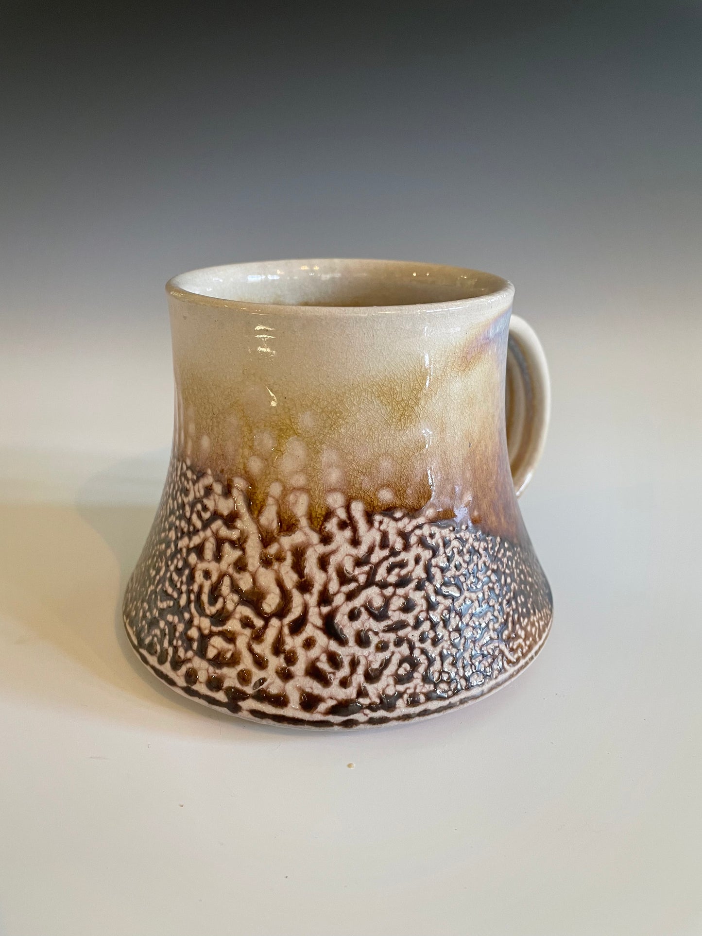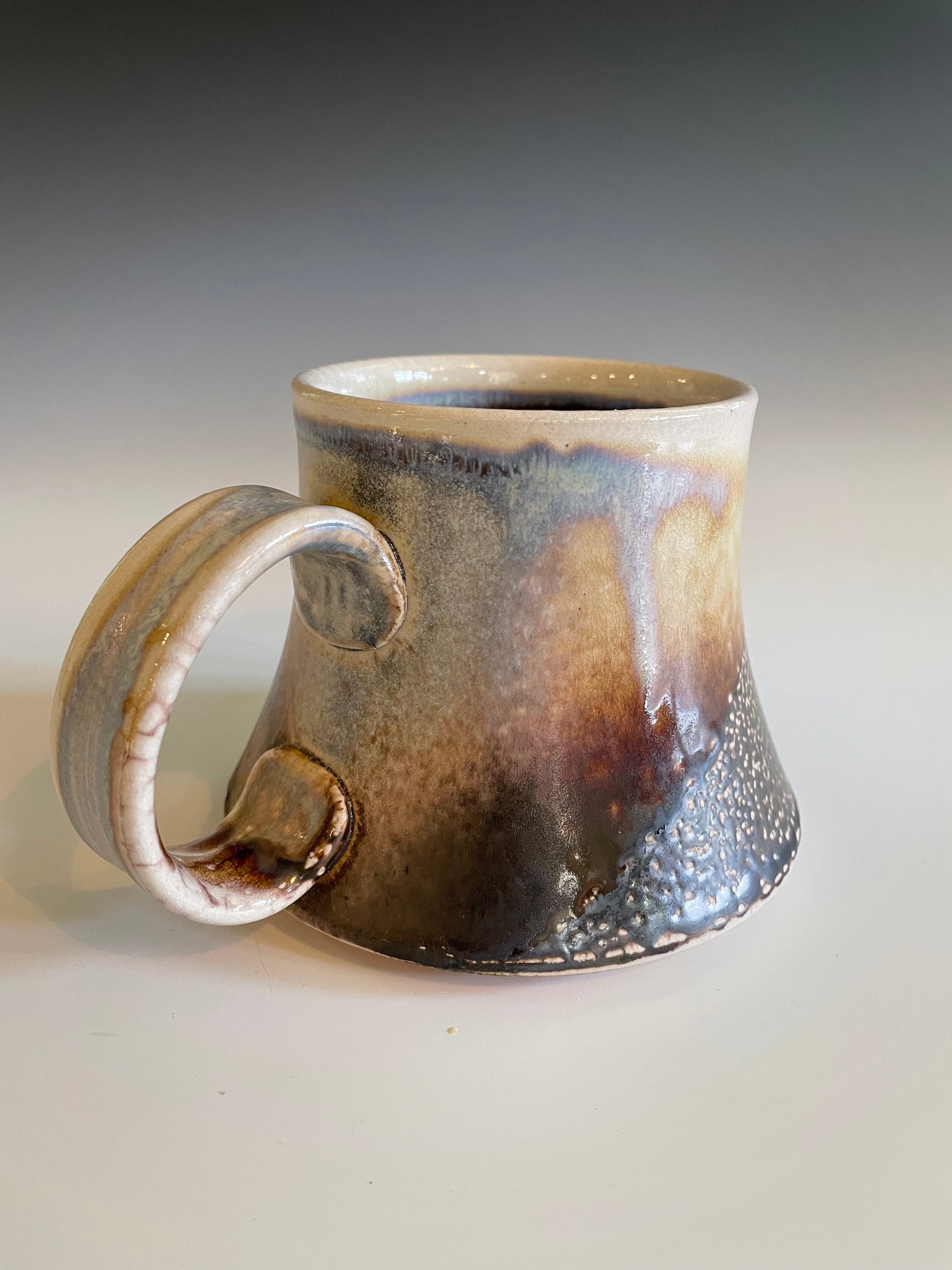 This mug boasts a generous 12-14oz capacity, flashing rainbow colors inside and out. Soda Fired with wood and waste vegetable oil, this piece is speckled with wood ash and soda to create a unique glaze. Top rack dishwasher safe. Hand wash recommended.