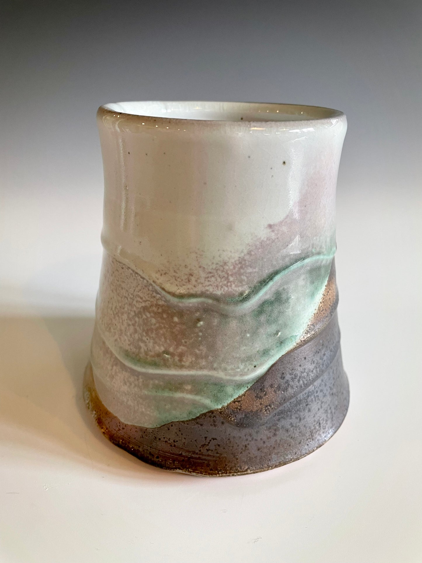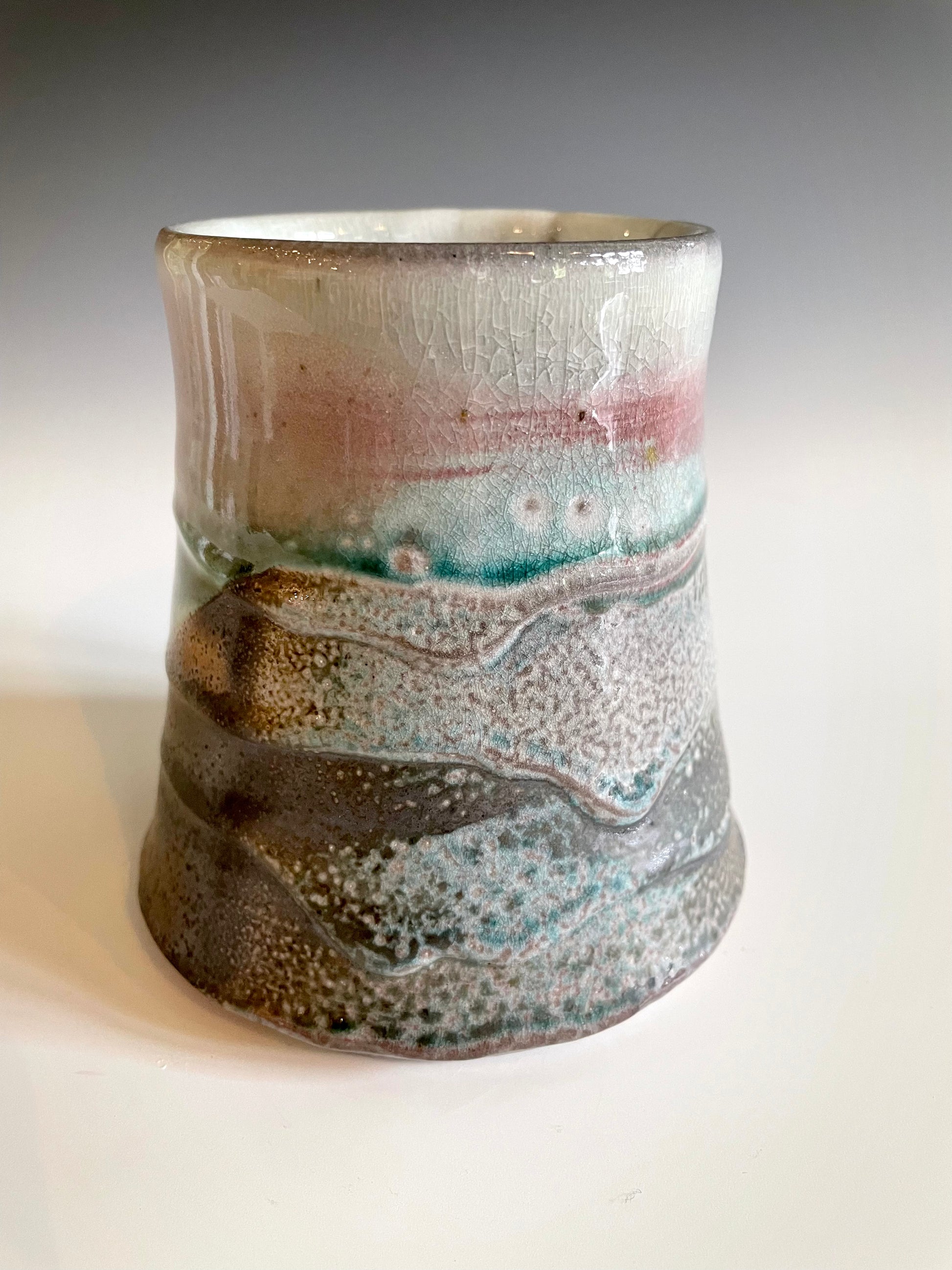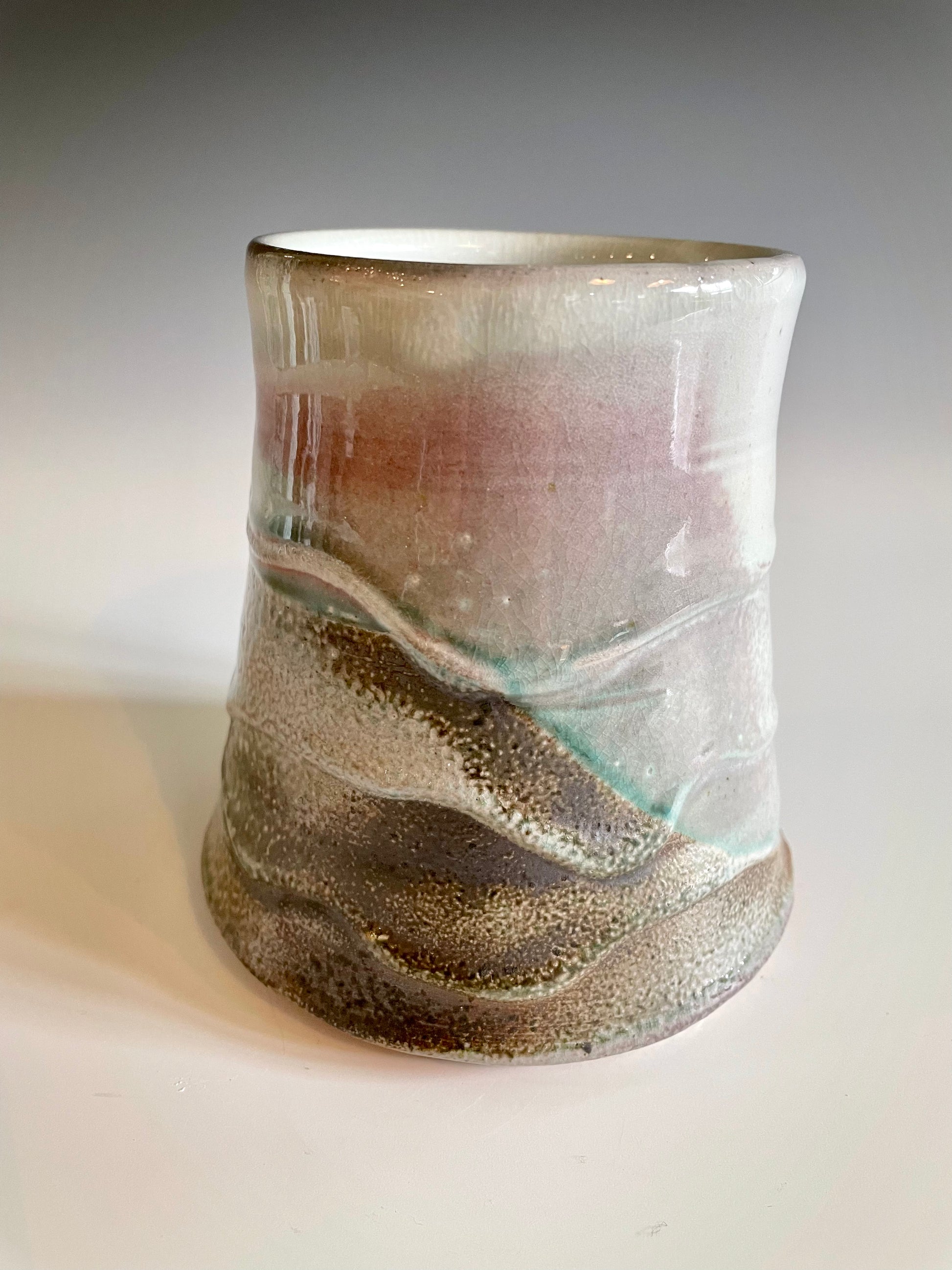 A tall tumbler for a tall order. Ice tea, fresh water with lemon, or a cold beer taste better in this soda fired 14oz tumbler. Flashing hues of teal and blush, this one is sure to become a quick favorite. Fired with wood and waste vegetable oil in a custom, cross-draft wood kiln. Top rack dishwasher safe, hand wash recommended.